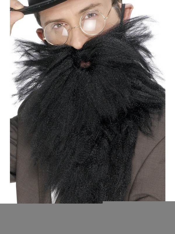 Long beard with moustache. Elastic ties to hook around ears to keep in place.