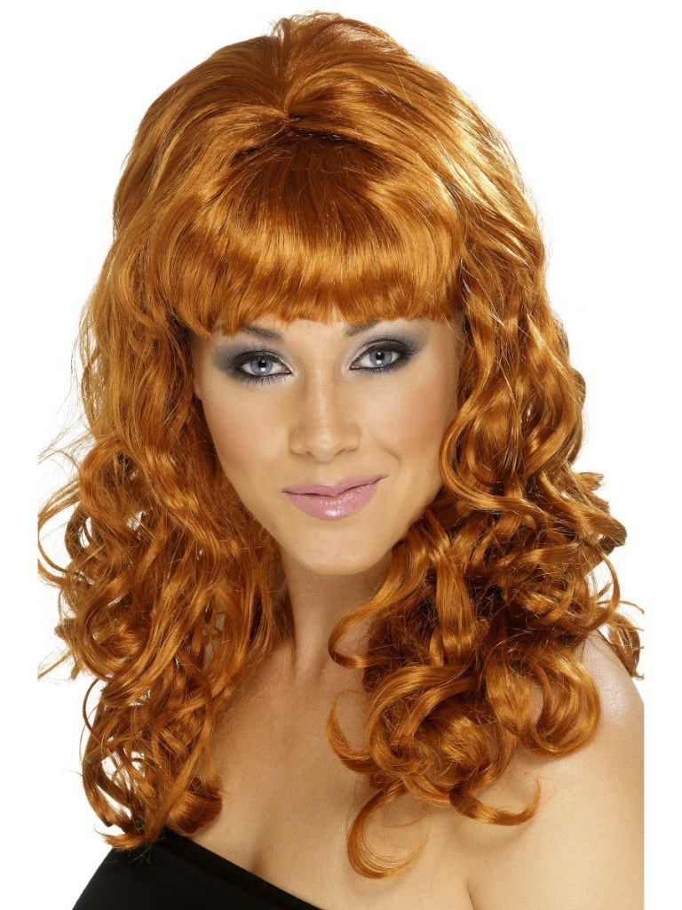 Shoulder length curly auburn wig with beehive and fringe.