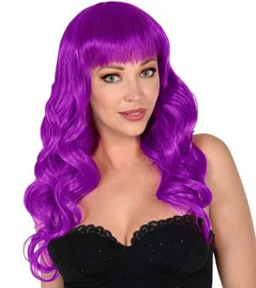 Long Purple curly Bella Wig with fringe. This wig features high quality professional synthetic wig. This is the perfect accessory to finish any 80's or 90's themed look!
