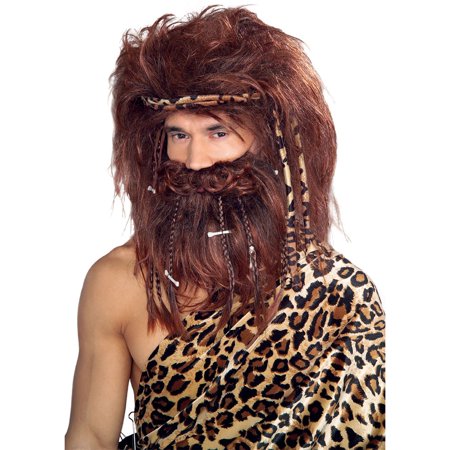 Brown Caveman wig with attached beard with bone and plait detailing and a leopard print headband. Wig also features an attached wig cap to hold the wig securely onto your head and to stop any stray hairs that might give away the look.
