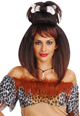 Shoulder legnth straight brown cavewoman wig with fringe and bine clip. Wig also features an attached wig cap to hold the wig securely onto your head and to stop any stray hairs that might give away the look.