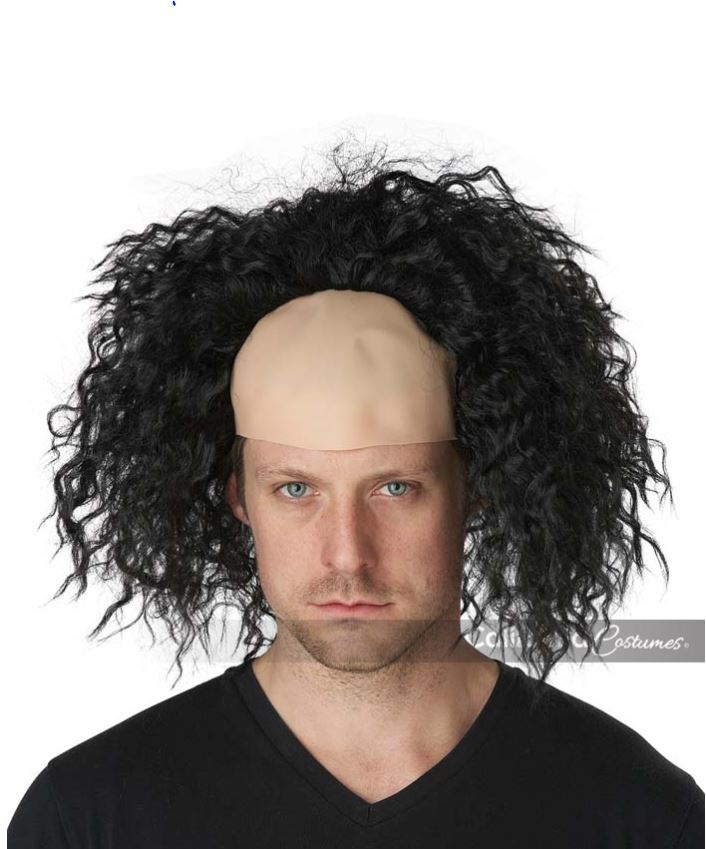 It's inherited, the Clown Pattern Baldness wig is a forehead bald cap with attached curly crimped black strands. The bald cap is in a light peach skin tone.