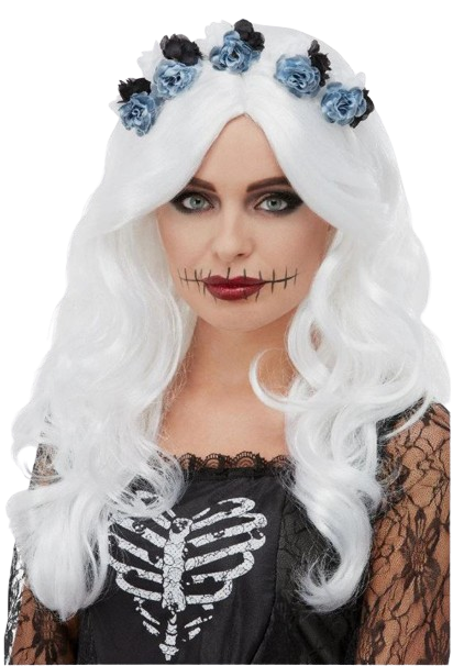 Day of the Dead costumes do not always have to be scary - glam it up with our Day of the Dead, white wig, adorned with attached flowers.