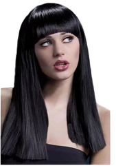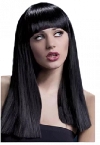 Deluxe Alexia Black wig. A long style wig with straight, blunt cut fringe and built in professional wig cap.