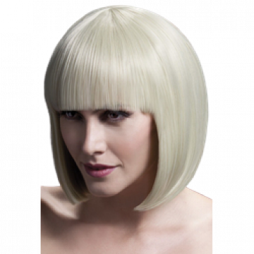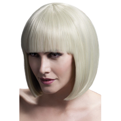 Deluxe Short Elise wig in a blonde colour with a straight blunt fringe. The wig has skin parting and includes an attached wig cap to hold the wig securely onto your head.