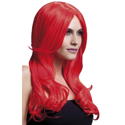 Red wavy shoulder length wig with faux skin parting. The wig also features an attached wig cap to hold the wig securely into place. The wig is styleable and heat resistant up to 120 degrees Celsius.