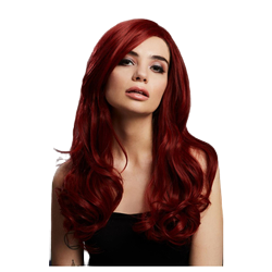 Ruby Red wavy shoulder length wig with faux skin parting. The wig also features an attached wig cap to hold the wig securely into place. The wig is styleable and heat resistant up to 120 degrees Celsius.