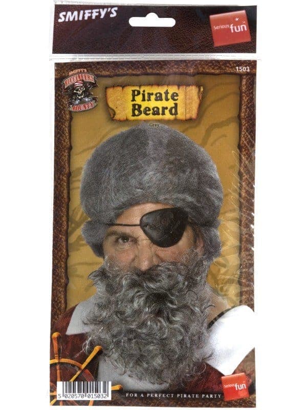 Grey coloured bushy Deluxe Pirate Beard with hints of black and comes with an attached elastic band to hold the mask onto your face.