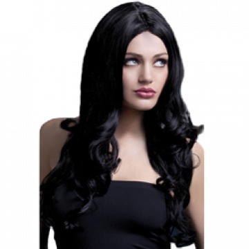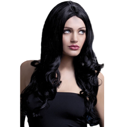 Long black curly deluxe Rhianne wig with faux skin parting. The wig also features an attached wig cap to hold the wig securely into place. The wig is styleable and heat resistant up to 120 degrees Celsius.
