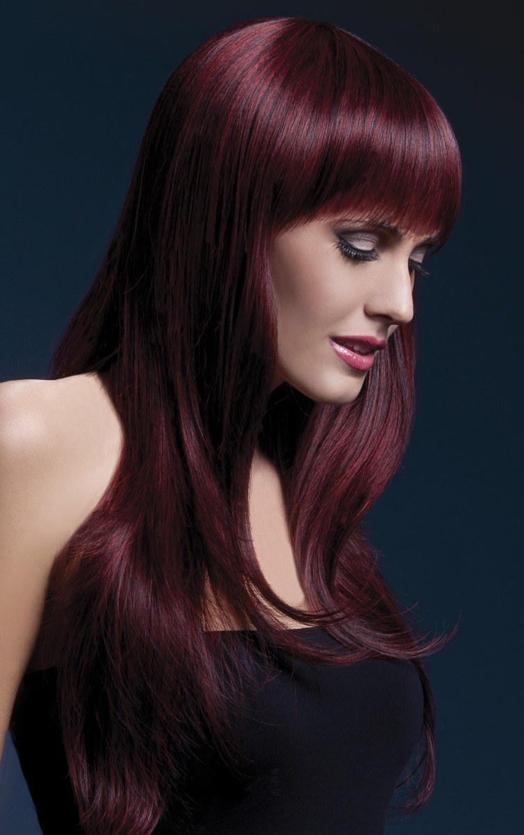 Deluxe Sienna wig in a deep black cherry colour with straight fringe and faux parting.