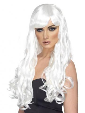 Long White wavy wig with fringe.