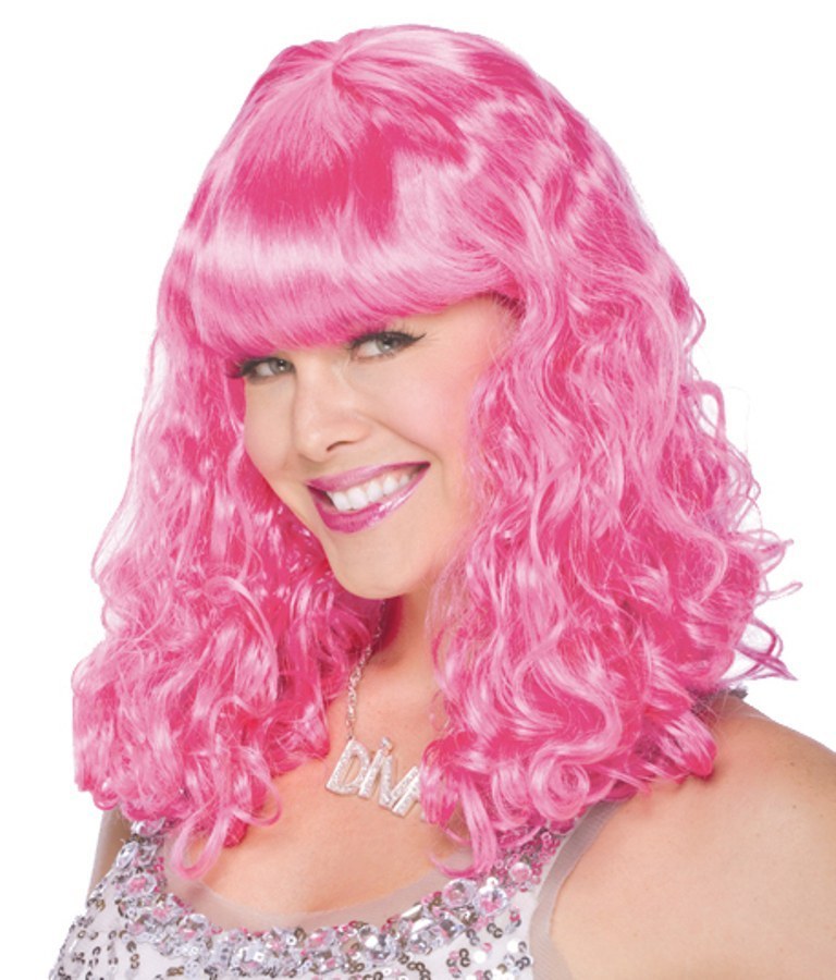 Shoulder length pink Wavy wig with fringe. Wig cap may be purchased separately to hold the wig securely onto your head and to stop any stray hairs that might give away the look.