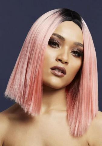 Two Toned Blend, Coral Pink, Inverted Long Bob, Centre Parting. The wig is styleable and heat resistant up to 120 degrees Celsius.