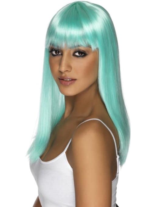 Glamourama Wig - Neon aqua is a shoulder length wig with fringe.