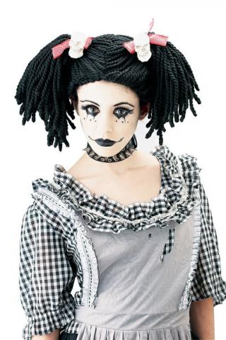 Gothic Rag Doll Wig wig in black with pigtails featuring skull bows.
