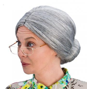 Grey Granny wig with bun. The wig also features an attached wig cap to hold the wig securely onto your head and to stop any stray hairs that might give away the look.