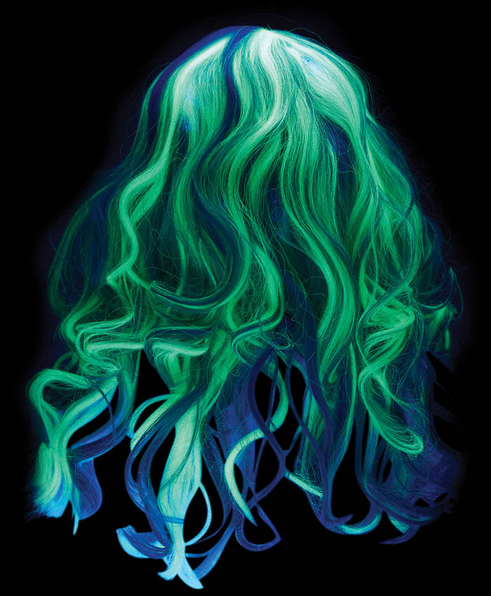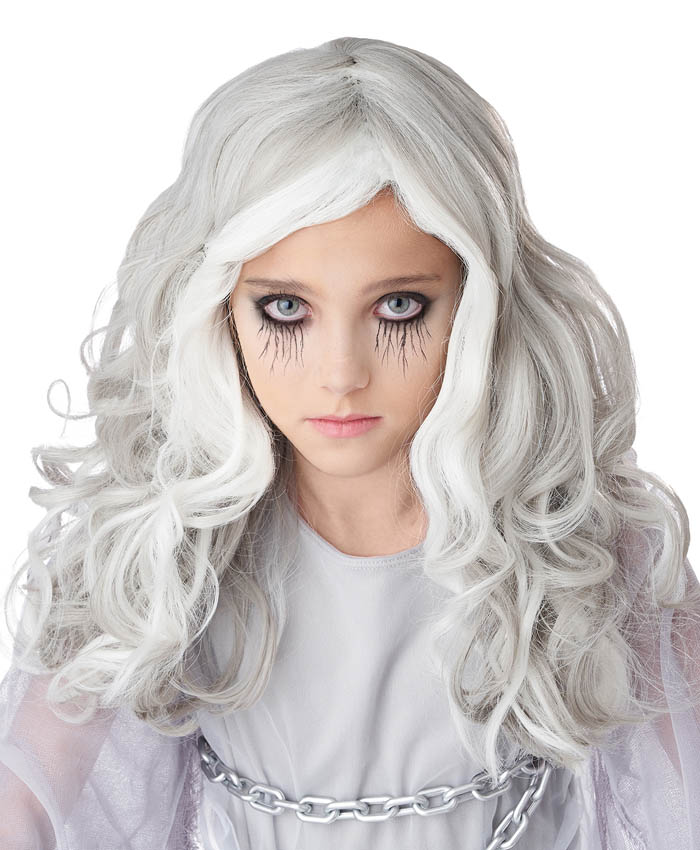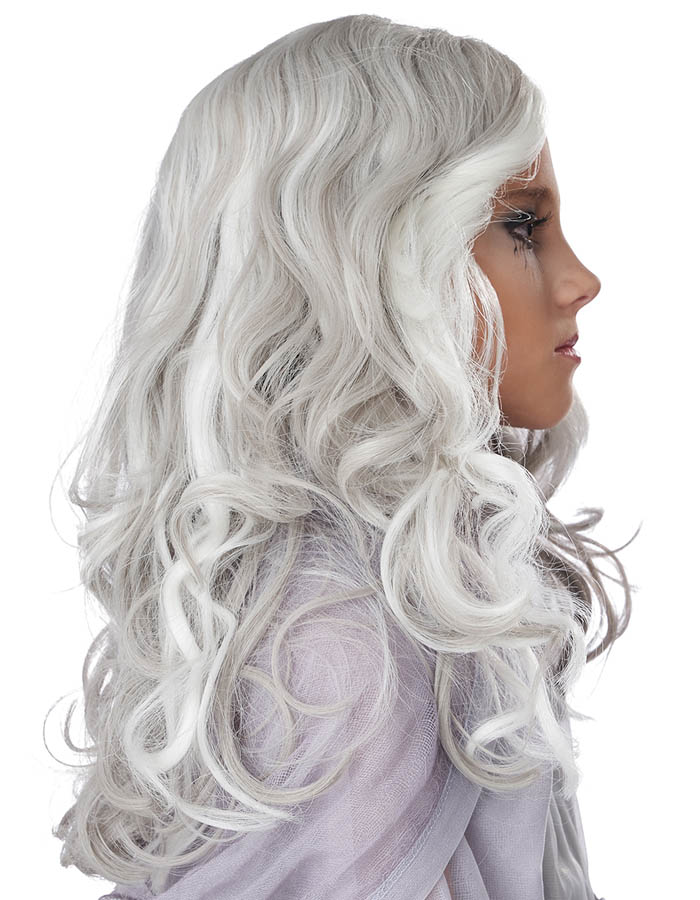 This long wavy silver wig glows in the dark to create an eerie effect.