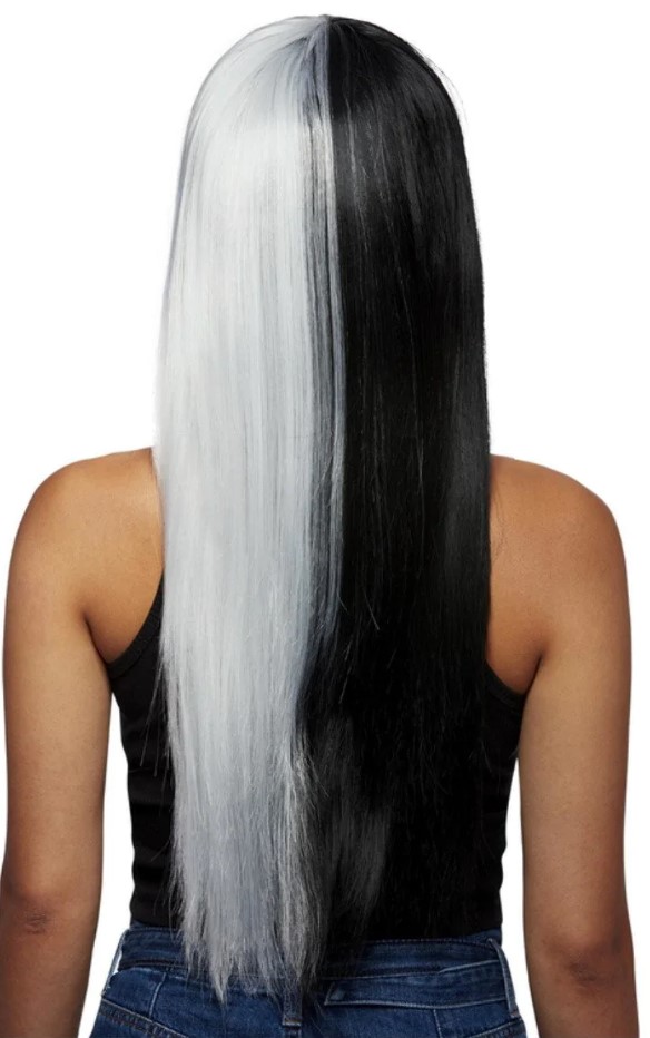 This Downtown Diva wig is suitable for any halloween fancy dress party! It features a long straight, heat resistant synthetic wig in a black & white split dye colour with a curved fringe. This wig will help you create any gothic themed look!