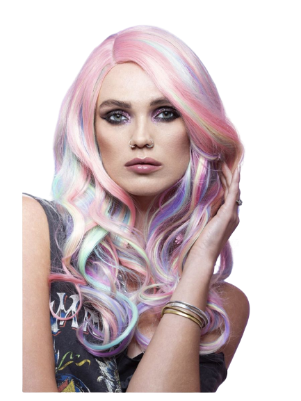 Long wig with teardrop curls and side parting in a mystical rainbow unicorn of soft and creamy pastels.