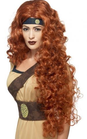 Long curly auburn Medieval Warrior Queen wig with attached wig cap to hold the wig securely onto your head and to stop any stray hairs that might give away the look.