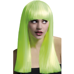 Deluxe Alexia Neon Yellow wig. A long style wig with straight, blunt cut fringe and built in professional wig cap.