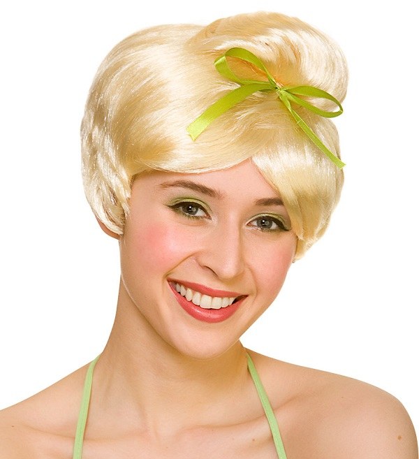 Short Blonde Neverland Fairy Wig with a green ribbon and an attached wig cap to hold the wig securely onto your head and to stop any stray hairs that might give away the look.