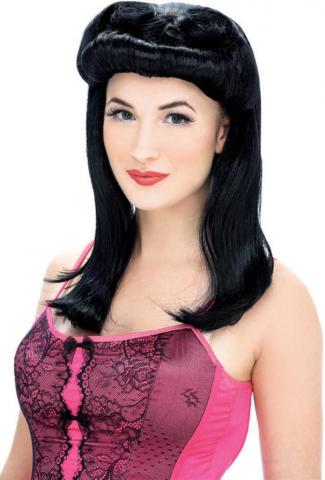 Shoulder length straight black Sexy Pin Up wig with rolled bangs and a twisted half up-do.