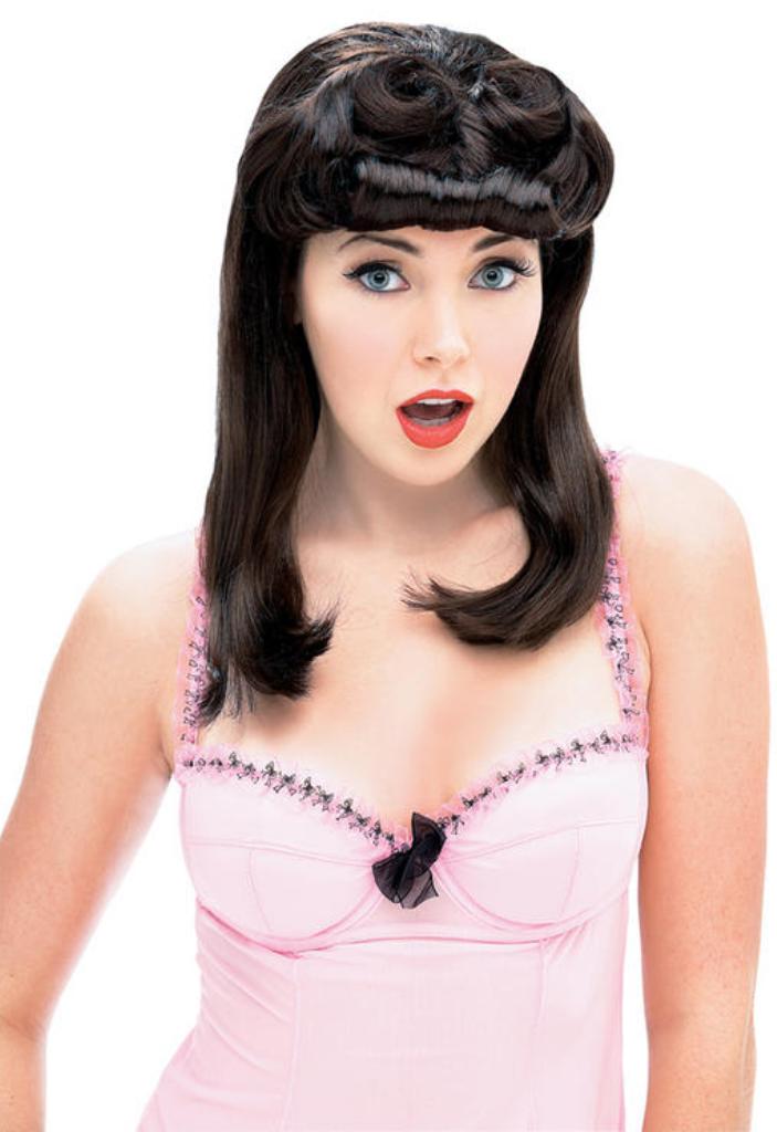 Shoulder length straight Brown Sexy Pin Up wig with rolled bangs and a twisted half up-do.