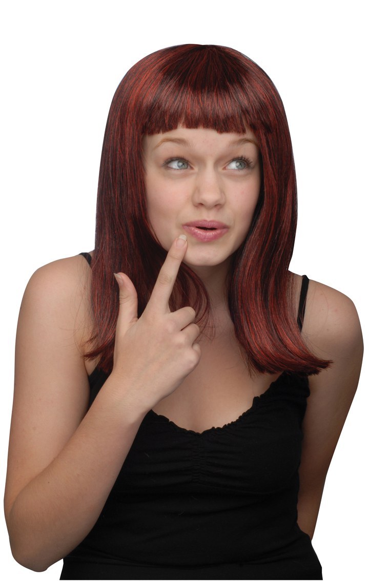 Long straight red/black shoulder length with with fringe. Wig also features an attached wig cap to hold the wig securely onto your head and to stop any stray hairs that might give away the look.