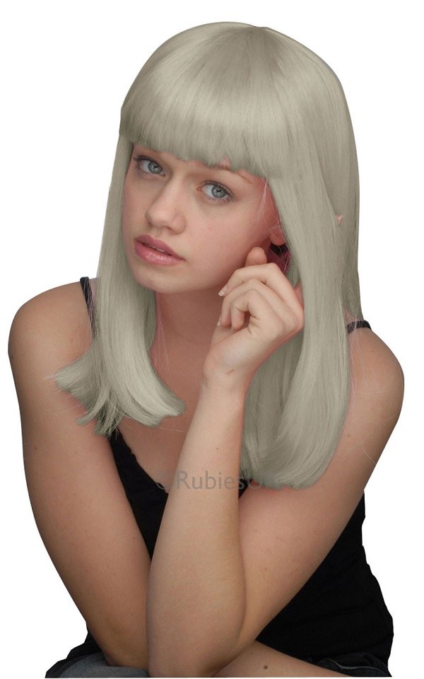 Straight Shoulder Length Silver Wig with fringe and an attached wig cap to hold the wig securely onto your head and to stop any stray hairs that might give away the look.