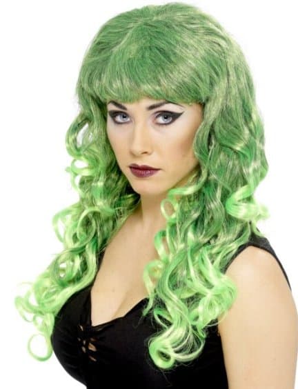 Siren Wig, long green wig with black low lights. The wig also features an attached wig cap to hold the wig securely onto your head and to stop any stray hairs that might give away the look.
