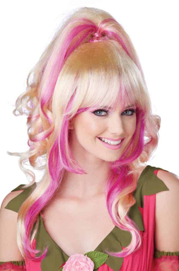 Two Toned blone and pink Sugar & Spice wig with a high knot wavy pony tail. Wig also features an attached wig cap to hold the wig securely onto your head and to stop any stray hairs that might give away the look.